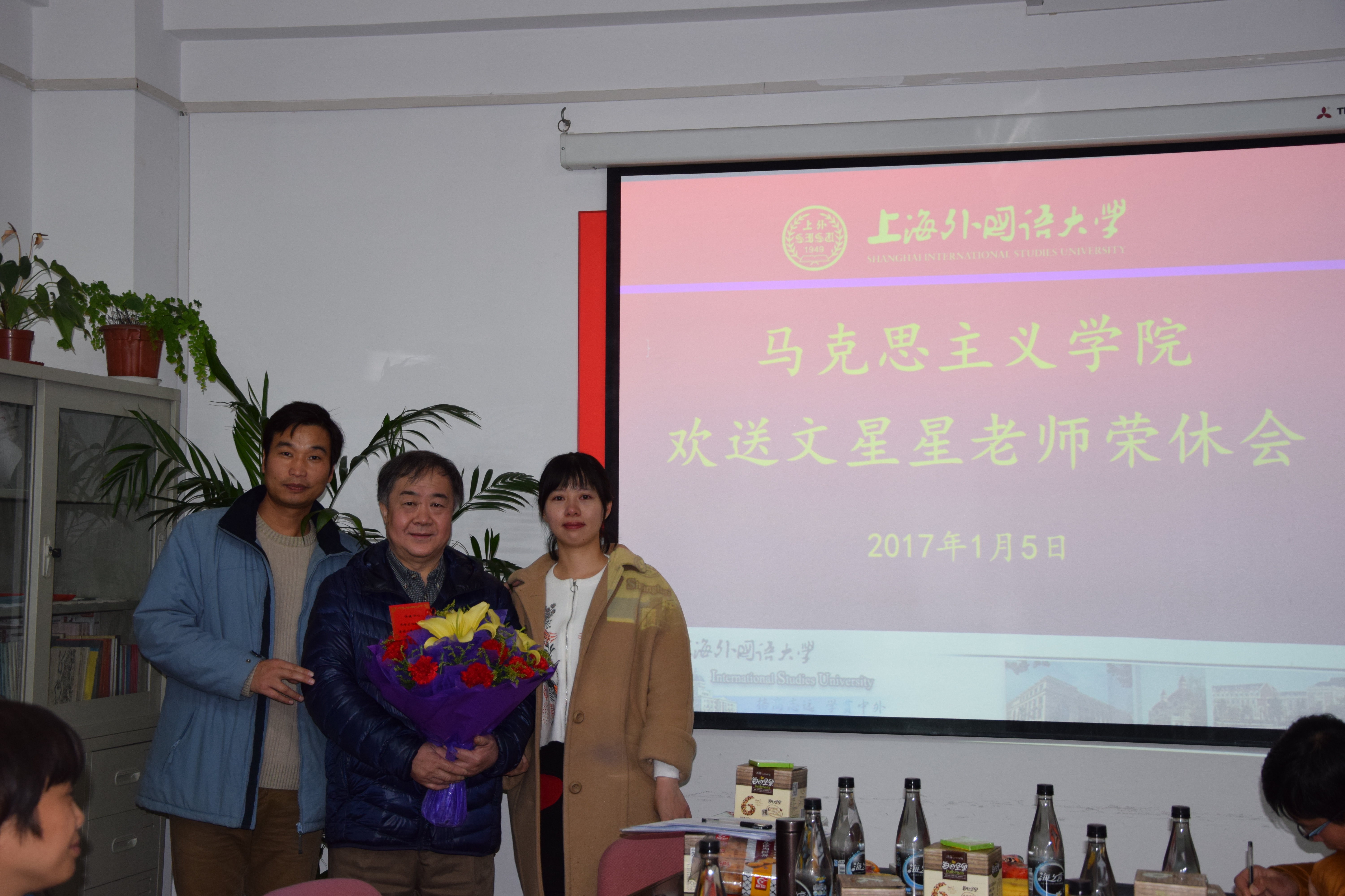 最后,文星星老师发表荣休感言时说到,在上外30年的生活、工作、发展和取得的点滴成就,都有赖于学校及学院为自己提供了一个大环境、大平台,感谢马院,感谢所有曾经帮助、支持和关心自己的人。并和大家分享自己从教30年的感受与体会,应把工作变成一种兴趣,做好目标定位。执着、努力地学习,尤其是向别人学习,持之以恒,天道酬勤。还要对自己负责、对学生负责,讲好每一节课,作好每一篇文章,对年轻教师寄予深切的希望与美好的祝福。