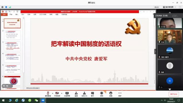 2020年9月21日晚,上海外国语大学马克思主义学院“学人论坛”第一期讲座顺利开讲,中央党校马克思主义学院唐爱军副教授受邀作了“把牢解读中国制度的话语权”的主题讲座。来自上海外国语大学、武汉大学、华北水利水电大学、青海大学等高校的师生聆听了讲座。本次讲座以腾讯会议的在线形式举行,由上海外国语大学马克思主义学院副教授王文臣主持。