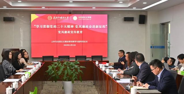 2022年11月21日上午,上海外国语大学马克思主义理论研究教学与宣传党总支开展“学习贯彻党的二十大精神 党风廉政奋进新征程”党风廉政宣传教育,上外马理论研究教学与宣传党总支书记孙宇伟主持会议。