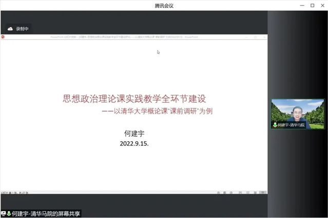 2022年9月15日晚,上海外国语大学马克思主义学院“思政课改革创新” 系列讲座第十四期开讲。清华大学马克思主义学院党委副书记何建宇副教授应邀围绕思政课实践教学全环节建设作线上专题分享。本次专题分享由上海外国语大学马克思主义学院于新娟教授主持。