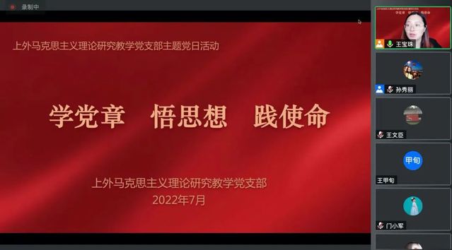 2022年7月15日上午,上海外国语大学马克思主义理论研究教学党支部开展“学党章 悟思想 践使命”的主题党日活动。上海外国语大学马克思主义理论研究教学党支部全体党员教师参加了此次线上学习交流,上外马克思主义理论研究教学党支部书记王宝珠主持会议。