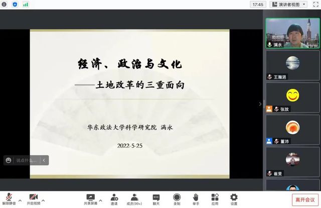 2022年5月25日晚,上海外国语大学马克思主义学院“学人论坛”第二十期顺利开讲。此次论坛主题为“经济、政治与文化:土地改革的三重面向”,主讲人为华东政法大学科学研究院满永教授,本次论坛以腾讯会议为平台,由上海外国语大学马克思主义学院张放副教授主持。