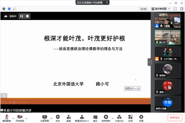 路小可老师的专题分享,折射出他对思政课教学的热情和对学生的关爱,丰富的教学经验,独到的问题意识,深刻透彻的分析,令与会师生受益匪浅。讲座最后,路小可老师就思政课具体知识点的教学方法、如何理解“思政课的本质是讲道理”等问题与校内外师生进行了深入探讨。
