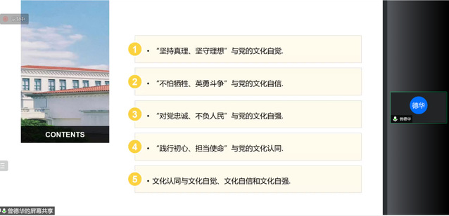 上海外国语大学马克思主义学院刘露萍副教授着重阐释伟大建党精神与红色革命精神之间的关系问题,认为红色文化所包含的一系列革命精神构成了中国共产党的精神谱系,而伟大建党精神是所有精神谱系的源头。红色革命精神和伟大建党精神内涵高度契合,伟大建党精神是对红色革命精神的凝练和概括。红色革命精神既是伟大建党精神在革命实践过程中的具体演绎和体现,同时它又通过文化资源的传播使伟大建党精神得到传承和光大。上海外国语大学马克思主义学院曾德华老师指出,“坚持真理、坚守理想”包含着极为深刻的文化自觉意识;“不怕牺牲、英勇斗争”蕴藏有深厚的文化自信因素;“对党忠诚、不负人民”彰显出深沉的文化自强色彩;“践行初心、担当使命”奠基于近代以来中国社会深层的文化认同心理。正是因为伟大建党精神拥有如此丰富的文化意蕴,所以它就成为了中国共产党的精神之源。