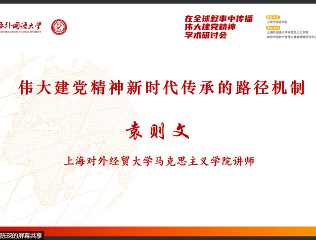 上海外国语大学马克思主义学院张放副教授从全球史视角指出,中国的国际话语权建设在思维上须做到从内外有别到内外统一,在内容上要注重差异性与批判性,开拓动态的、互动的、现实的、嵌构于全球权力结构的话语权建设路向。上海外国语大学马克思主义郭琳老师提出,我们可以从四个方面对伟大建党精神展开国际传播:一是凸显马克思主义在全球化进程中的理论与实践贡献;二是突出中国共产党的自我革新与积极调适;三是呈现不怕牺牲、艰苦奋斗的革命英雄主义传统;四是强调人民至上的关键性价值。上海对外经贸大学马克思主义学院袁则文老师强调,新时代伟大建党精神传承的路径机制可从党内思想政治建设、学校思想政治教育、社会红色文化传播与“互联网+”及网上虚拟空间阵地建设等方面进行全方位建构。