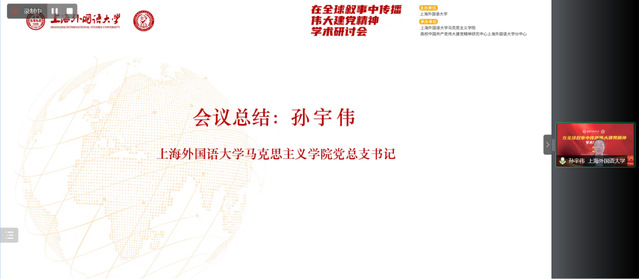 会议闭幕式由上海外国语大学马克思主义学院党总支书记孙宇伟主持。孙老师表示,对来自诸多高校的与会专家、学者以及同学们参加本次线上研讨会表示感谢;与会专家、学者围绕伟大建党精神的科学内涵、赓续发展、话语建构、战略策略问题发表精彩见解,与会师生深受启发,受益匪浅。上海外国语大学将进一步聚焦理论阐释和全球传播,将伟大建党精神研究好、讲述好、传承好。