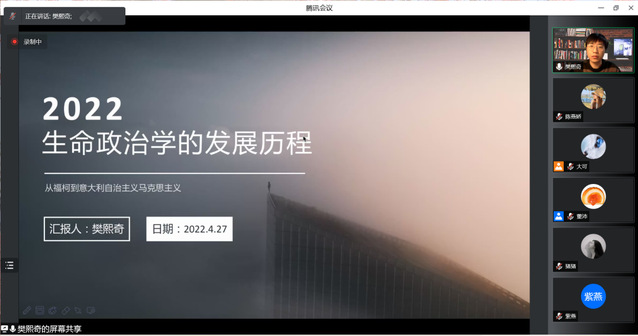 2022年4月27日晚,上海外国语大学马克思主义学院本学年第二十期“青年学术沙龙”如期举行。此次沙龙的主题为“生命政治学的发展历程:从福柯到意大利自治马克思主义”,主讲人为上海第二工业大学马克思主义学院樊熙奇老师,此次沙龙由上海外国语大学马克思主义学院郭慧超老师主持。