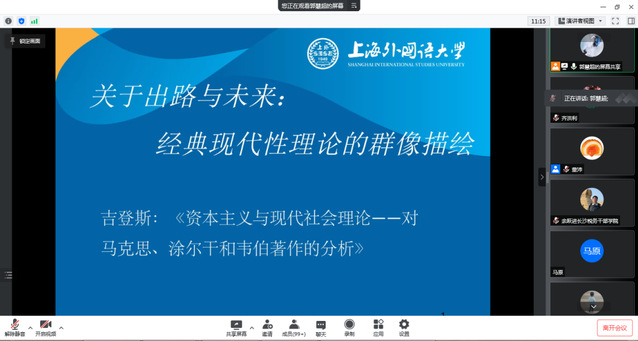 2022年4月13日晚,上海外国语大学马克思主义学院“西索聊原·马克思主义经典文本读书会”第十二期顺利举办。此次读书会的主题为“关于出路与未来:经典现代性理论的群像描绘”,主讲人为上海外国语大学马克思主义学院郭慧超老师,读书会由上海外国语大学马克思主义学院王宝珠副教授主持。