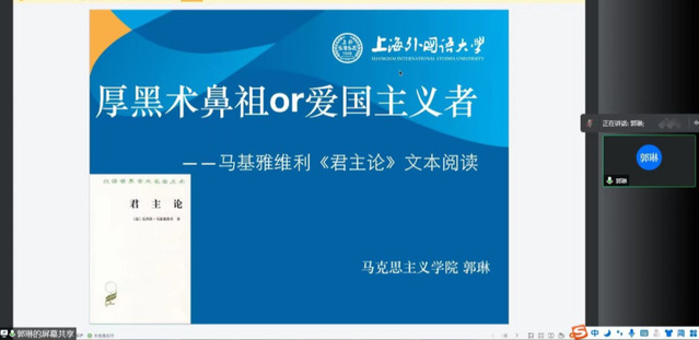 2022年4月6日晚,上海外国语大学马克思主义学院“西索聊原·马克思主义经典文本读书会”第九期顺利举办。此次读书会的主题为“厚黑术鼻祖or爱国主义者:马基雅维利《君主论》文本阅读”,主讲人为上海外国语大学马克思主义学院郭琳老师,读书会由上海外国语大学马克思主义学院张放副教授主持。