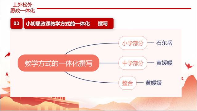 思政一体,首要任务就是立足课堂,通过思考把有梯度的、螺旋式上升的思政课带给学生。经过本学期的摸索与实践,我校已逐步形成上外松外联盟“大中小思政课一体化”模式。未来我们将继续整合优质教育资源,提升思政课教师队伍的协同意识,凝聚育人合力,做到思政一体,向前一步!
