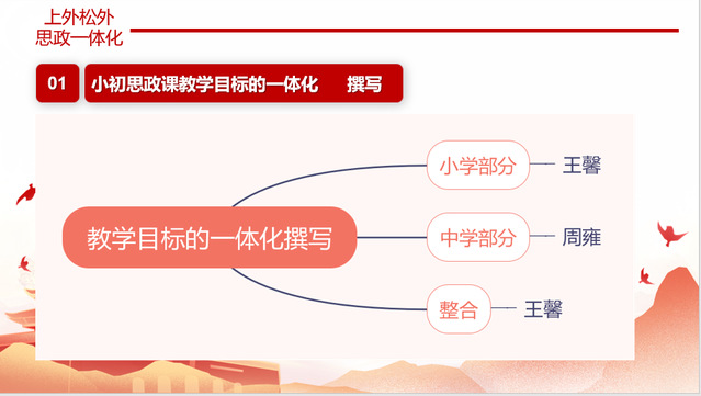 我校小初教研组启动每月1次集体备课活动,两部教师联合联盟内学校通过前期梳理大学、中学、小学道德与法治课程框架,并通过学生问卷了解学生关注热点,完成了小初思政教学目标一体化、教学内容一体化、教学方式一体化的教研方向。