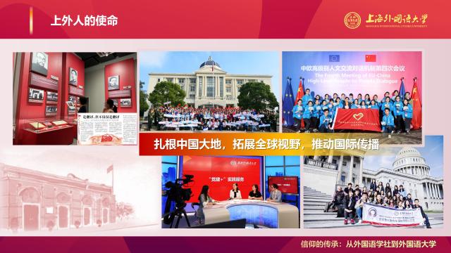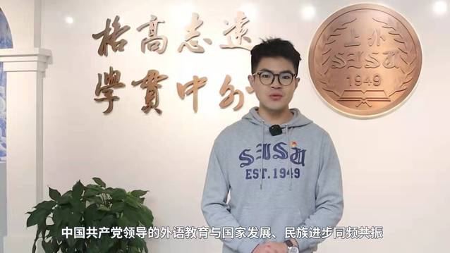 百年前,中国进步青年用外语敲开理想信念之门,阅读并译介马列经典,马克思主义真理在中国开始传播。上外创校以来,从姜椿芳老校长组建“一文一武”两支队伍服务国家建设,到王季愚校长为外语教育事业呕心沥血,再到一代代为教材辞书编纂默默耕耘的上外人……外语人始终将个人前途与家国命运紧密相连,坚守理想信念;进入新时代,外语人赓续红色血脉,向世界讲好中国故事,传播好中国声音,积极传播马克思主义中国化最新理论成果,投身实现中华民族伟大复兴的新征程!