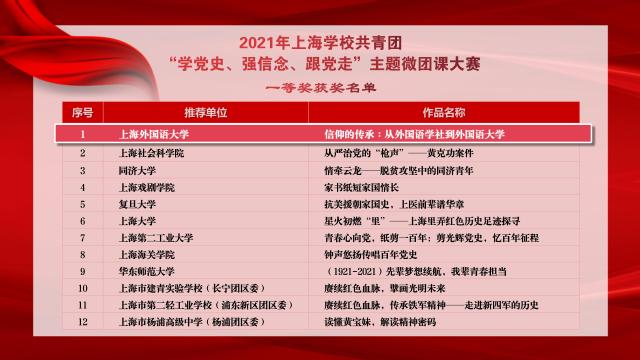 近日,由共青团上海市委员会、上海市学生联合会举办的“2021年上海学校共青团‘学党史、强信念、跟党走’主题微团课大赛”公布获奖名单,上海外国语大学推荐的微团课《信仰的传承:从外国语学社到外国语大学》荣获一等奖。据悉,此次大赛共收到微团课作品187件,共评选出一等奖作品12个。