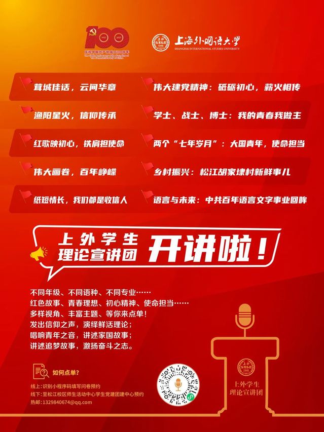 即日起,上海外国语大学各学生党支部、团支部可在学生党建团建中心“点单”预约邀请宣讲团团队开展主题宣讲。本学期,宣讲团成员将继续走进松江社区,走进乡村基层单位和中小学校园,向社区群众、中小学生讲好讲活党史故事,扎实做好学生理论宣讲工作。