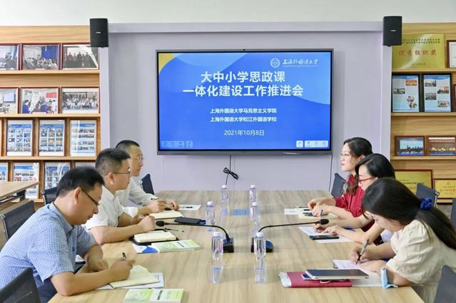 为贯彻落实习近平总书记在全国学校思想政治理论课教师座谈会上的重要讲话精神,以及《关于深化新时代学校思想政治理论课改革创新的若干意见》《新时代学校思想政治理论课改革创新实施方案》《关于加强新时代马克思主义学院建设的意见》等文件要求,推动大中小学思政课高质量发展,10月8日下午,上海外国语大学马克思主义学院与上海外国语大学松江外国语学校,举行大中小学思政课一体化建设工作推进会。校党委常委、马克思主义学院院长衣永刚、上海外国语大学马克思主义理论研究教学与宣传党总支书记孙宇伟、马克思主义学院副院长门小军、上海外国语大学松江外国语学校副校长左洋洋、朱海燕、政教处副主任徐珺参加工作推进会。