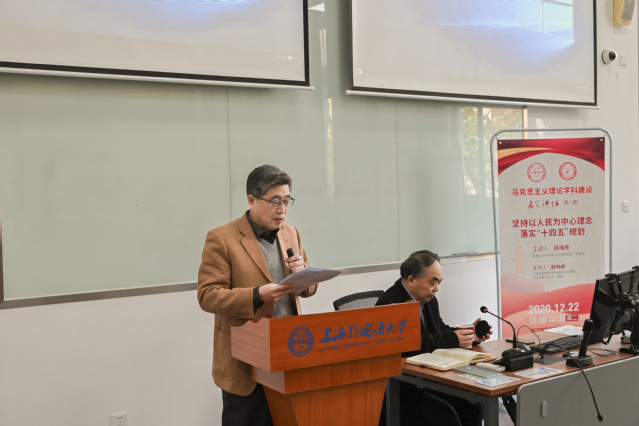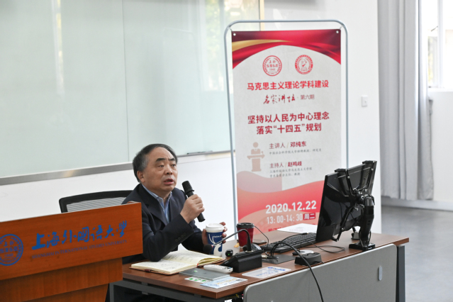 2020年12月22日下午,上海外国语大学马克思主义学院“名家讲坛”第六期开讲。中国社会科学院大学邓纯东教授应邀作“坚持以人民中心理念 落实‘十四五’规划”的专题讲座。本次讲座于上海外国语大学松江校区开展,由上外马克思主义学院学术委员会主任赵鸣歧教授主持。