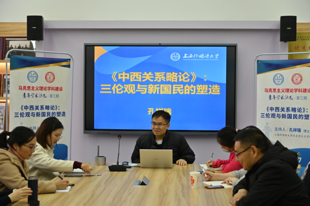 2020年11月27日下午,上海外国大学马克思主义学院举办了本学年第三期“青年学术沙龙”。此次沙龙的主题为“《中西关系略论》:三伦观与新国民的塑造”,主讲人为上外马克思主义学院孔祥瑞老师,上外马院教师和研究生参加了沙龙。