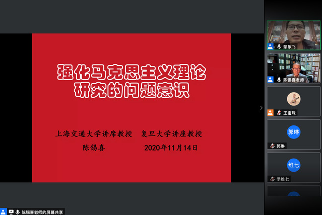 2020年11月14日晚,上海外国语大学马克思主义学院“名家讲坛”第四期顺利开讲。上海交通大学讲席教授、复旦大学讲座教授、上海外国语大学思政课特聘教授陈锡喜应邀作了“强化马克思主义理论研究的问题意识”的专题讲座。本次讲座以腾讯会议为平台,由上海外国语大学马克思主义学院副院长蒙象飞教授主持。