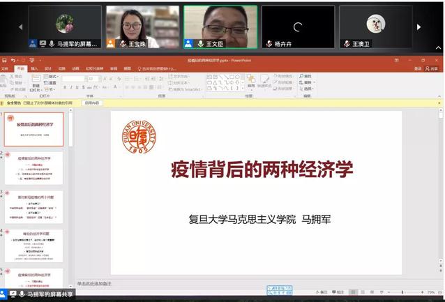 2020年9月11日,上海外国语大学马克思主义学院“名家讲坛”第一期顺利开讲。复旦大学马克思主义学院马拥军教授应邀作了“疫情背后的两种经济学”的主题讲座。来自上海外国语大学、复旦大学、上海财经大学、西北农林科技大学等高校的师生聆听了讲座。本次讲座以腾讯会议的在线形式举行,由上海外国语大学马克思主义学院副教授王文臣主持。