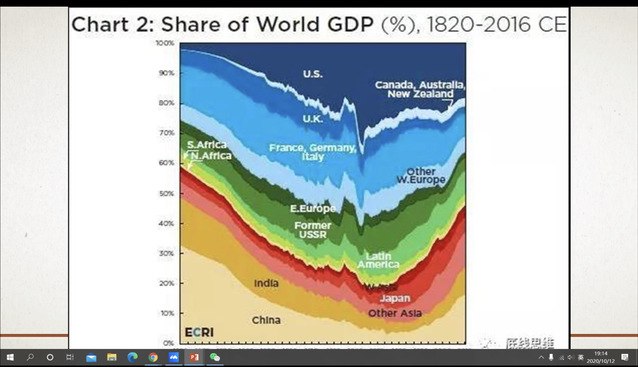 肖巍教授用四张图表向大家展示了中国最近这些年所取得的经济发展成就。中国在整个世界经济中所占GDP比重逐年上升,已成为仅次于美国的第二大经济实体。针对这一趋势,肖巍教授谈到,我国现阶段发展态势固然可喜,但仍有不足,国家还需要保有居安思危的忧患意识。他还指出了中国在经济发展过程中还存在一些亟待解决的问题,如增长方式粗放、产业能级与文化含金量低、资本结构扭曲等。