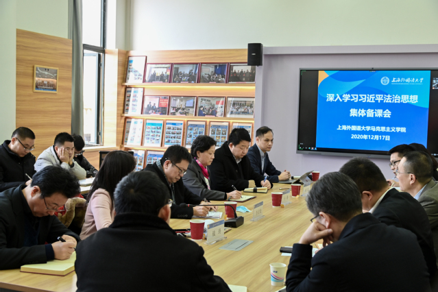 2020年12月17日,上海外国语大学马克思主义学院举行深入学习习近平法治思想的集体备课会议,本次集体备课由马克思主义学院与法学院联合备课。上海外国语大学校长李岩松,校领导王静、钱玲、林学雷、张静、查明建等参加了集体备课。