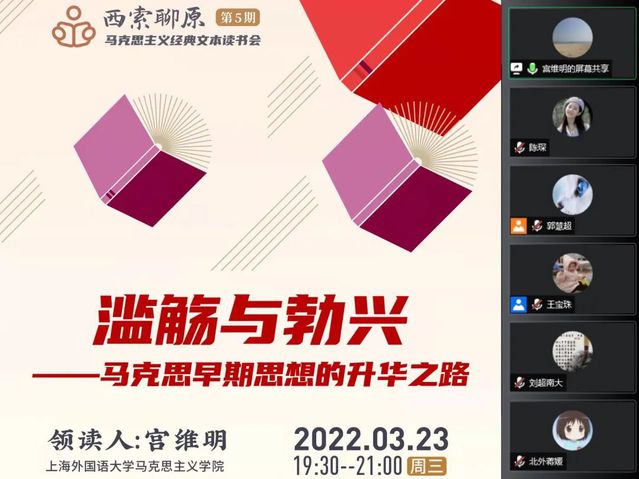 学院在第一时间组织策划“西索聊原·马克思主义经典文本读书会”,这是面向全校师生的研读马克思主义经典原著的读书会。以阅读马克思主义经典文本为基础,以挖掘经典文本中的思想政治教育资源为旨趣,致力于营造读书氛围、提升人文素养的学术活动。以读书会为平台,以“原著”为媒介,以“聊”为基本方式,以期参与师生能够共汲取经典之菁华,同感经典之魅力,进而能够在理论积淀中,实现“燎”之效果。每一期读书会由一位老师领读,校内外师生共同参加,目前已经成功举办了六期,效果非同凡响,从王文臣老师的“异化、对象化、符号化、数字化的表达与本质——基于政治经济学的批判进路”、到宫维明老师“滥觞与勃兴——马克思早期思想的升华之路”再到王宝珠老师“监控资本主义时代的劳动过程——基于马克思劳动过程理论的思考”,老师们从经典文本切入,带领同学们不断进行经典文本对话、智慧碰撞和思想提升。