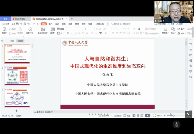 张云飞教授从建设人与自然和谐共生现代化的超越之路、建设人与自然和谐共生现代化的基本要求、建设人与自然和谐共生现代化的系统路径等多个角度讨论了人与自然和谐共生的中国式现代化。