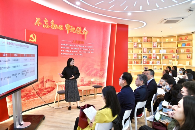 教学党支部教师王瀚浥从现代化之问的角度讲解了中国式现代化的科学内涵和根本遵循,阐释了中国式现代化是人口规模巨大的现代化、全体人民共同富裕的现代化、物质文明和精神文明相协调的现代化、人与自然和谐共生的现代化、走和平发展道路的现代化。