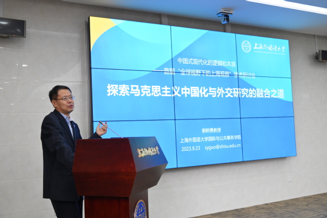 国家社科基金重大项目“习近平外交思想研究”首席专家、上海外国语大学国际关系和公共事务学院院长郭树勇教授,作《探索马克思主义中国化与外交研究的融合之道》的主旨报告。他认为,国际化视角从来都是理解马克思主义中国化的一把钥匙。要把握新时代马克思主义中国化的丰富内涵,必须继承与超越第一期、第二期中国化成果,深入研究中国化了的马克思主义的再世界性、再国际化和再时代化问题,具体来说有必要也有更多的条件探索外交思想研究与马克思主义中国化的交叉融合之道,要用以我为主、兼收并蓄的心态看待中国国际关系理论建设的历史、现实和未来;以中国式现代化的思维来发掘中国古代优秀文化以滋养“全球之治”。