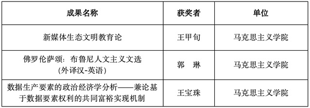 近日,上海外国语大学公布了《2023年度校级优秀科研成果奖获奖名单》。马克思主义学院王甲旬老师《新媒体生态文明教育论》学术奖-著作类三等奖;郭琳老师《佛罗伦萨颂:布鲁尼人文主义文选》翻译奖-外译汉二等奖;王宝珠老师《数据生产要素的政治经济学分析——兼论基于数据要素权利的共同富裕实现机制》学术奖-论文类三等奖。