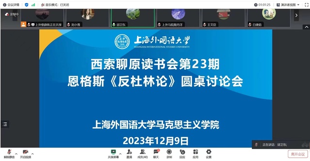 本次圆桌讨论会由上外马克思主义学院“西索聊原读书会”与马克思主义基本原理课程中心联合举办,近40名同学参加学习研讨,与会同学对恩格斯的独特贡献有了更深的理解并认识到了阅读马克思主义经典文本的重要性。